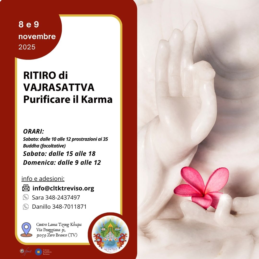 Integrare i fondamenti del buddhismo nella vita quotidiana – ogni lunedì alle 20:30 Dal 6 ottobre 2025 fino a primavera 2026 continueremo la disamina del “Commentario al Bodhisattvacharyavatara” di Ghesce Yesce Tobden e del testo radice “Bodhisattvacharyavatara, impegnarsi nella condotta dei bodhisattva” di Shantideva. Questo percorso ha l’obiettivo di affrontare ed approfondire alcuni dei principali temi della...